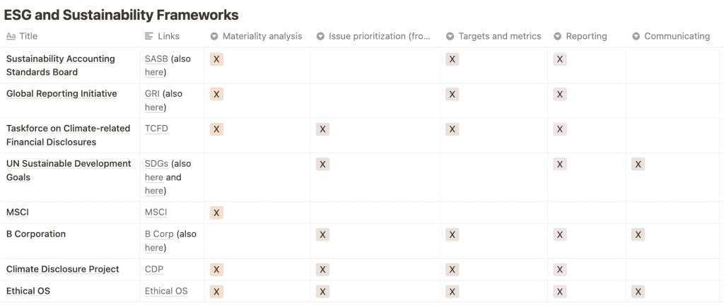 Unlike areas such as finance and accounting, there is currently no one agreed-upon framework or standard that must be used when companies define and report on their ESG priorities; rather, there are a host of ESG/sustainability frameworks that can be leveraged. For startups, we believe it is most efficient to use the frameworks as a check to make sure they haven’t missed critical materialities in each of the three ESG categories.